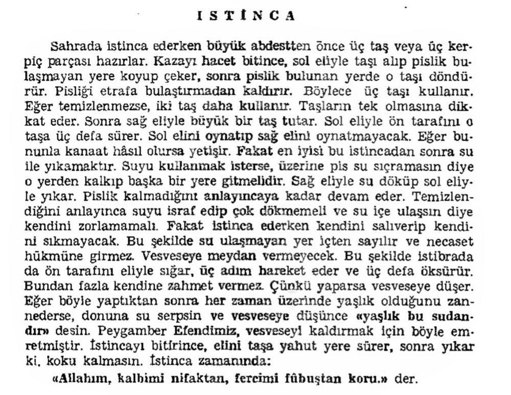 Bu sefer uzun olduğu için yazmaya üşendim, resmini iliştiriyorum. İstinca, tuvalet ihtiyacını giderdikten sonra dışkı ve idrar kalıntısını su veya benzeri temizleyici maddelerle temizleme işlemidir. Gazzâlî, diyor ki: