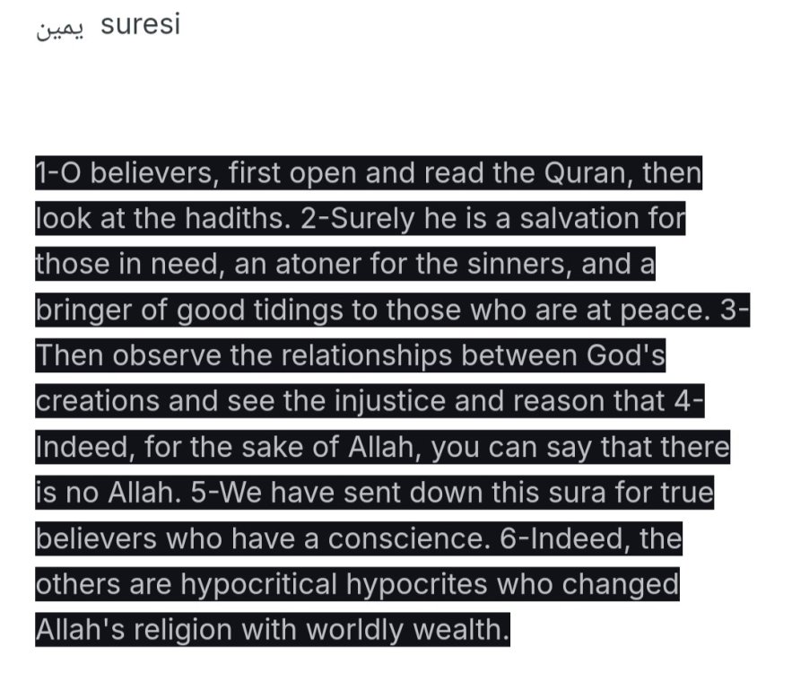 3. 1-Ey iman edenler önce açın Kur'an-ı okuyun sonra hadislere bakın 2-Şüphesiz ki dardakilere bir kurtuluş, günahkarlara bir kefaretçi, esenlikler içindekilere bir müjdecidir o 3-Daha sonra Allah'ın yarattıkları arasındaki ilişkileri gözleyip adaletsizliği görüp akledin ki 4-Şüphesiz Allah'ın hakkı için Allâh yoktur diyebilesiniz 5-İşte biz bu sureyi vicdanı olan gerçek müminler için indirdik 6-And olsun ki diğerleri dünya malı ile Allah'ın dinini değişen riyakar münafıklardır