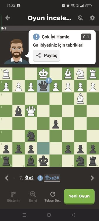11. Ava giden avlanır Bu #chess oyununa bakın: Waleediqbalofficial ile athinkingsadman - https://www.chess.com/live/game/120920670858 @buddha bu oyunu tahta üzerinde paylaşsana telefondan olmuyor [Event "Waleediqbalofficial vs. athinkingsadman"] [Site "Chess.com"] [Date "2024-11-16"] [White "Waleediqbalofficial"] [Black "athinkingsadman"] [Result "0-1"] [WhiteElo "435"] [BlackElo "471"] [TimeControl "600"] [Termination "athinkingsadman mat ederek kazandı"] 1. e4 Nf6 2. Bc4 e6 3. Qf3 d5 4. exd5 exd5 5. Bb3 Bg4 6. Qf4 Qe7+ 7. Ne2 Qxe2# 0-1